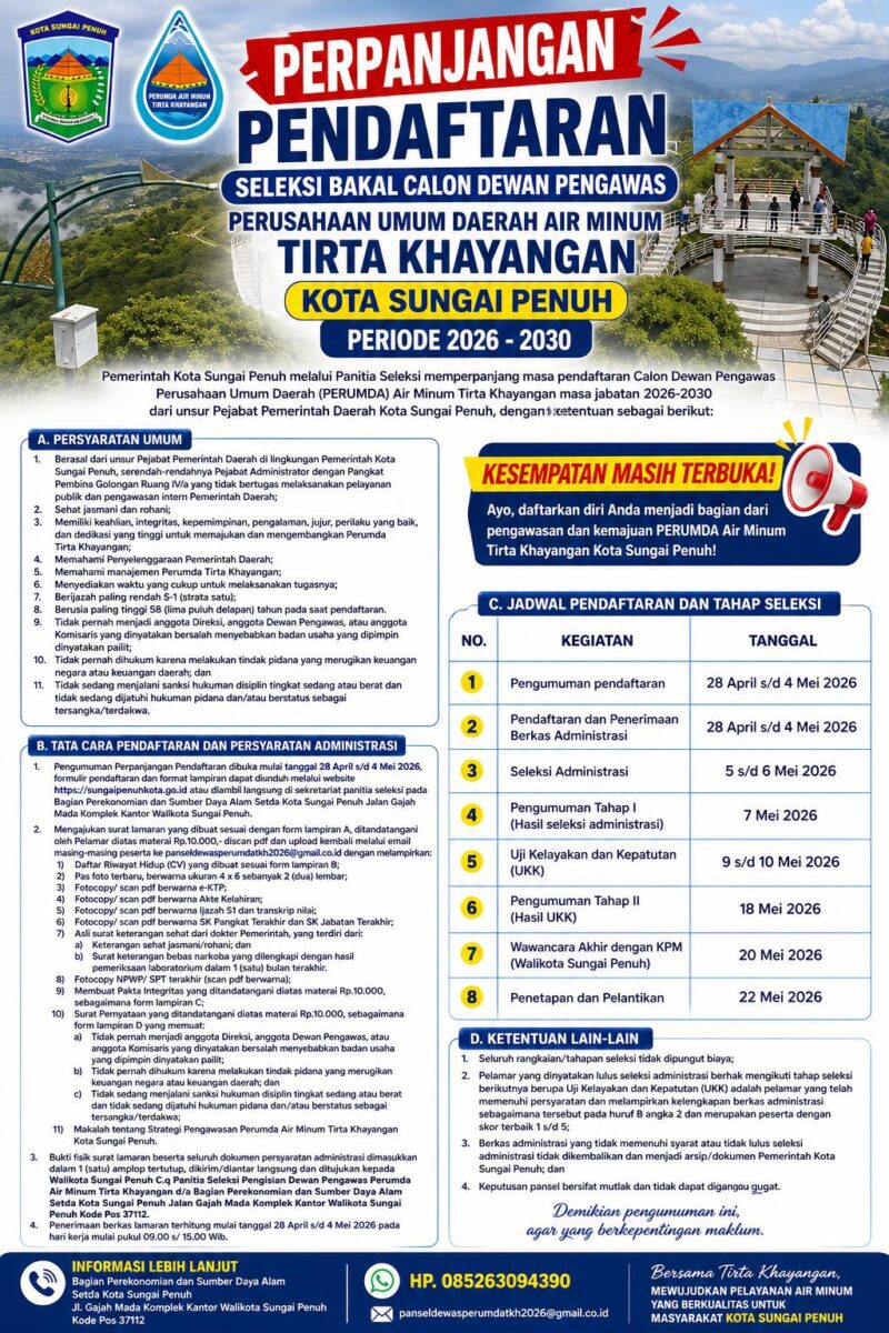 SUNGAI PENUH, Jemarionline.com — Pemerintah Kota Sungai Penuh memperpanjang pendaftaran seleksi Dewan Pengawas Perumda Tirta Khayangan hingga 4 Mei 2026.